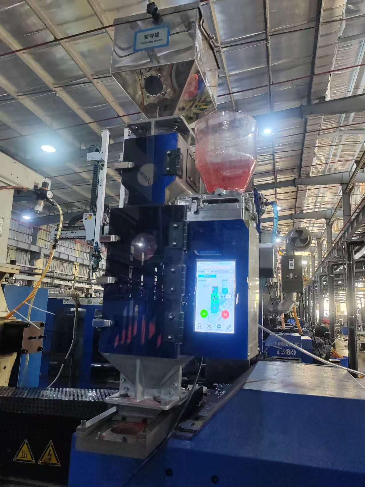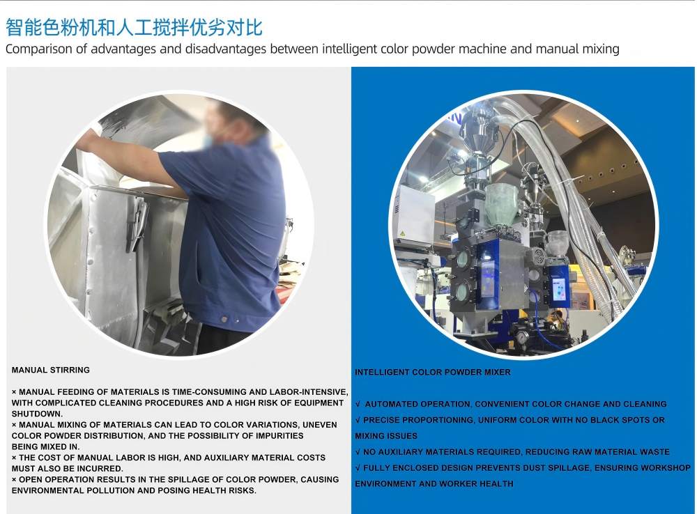 100 kg/t"Intelligent Color Powder Mixing" kan integreres sømløst med sentraliserte fôringssystemer, sentrale transportsystemer og automatiske materialhåndteringssystemer. Plastfargemikseren er utstyrt med veiesensorer med høy presisjon, som sikrer ensartethet i blandeprosessen og fargekonsistensen, og støtter automatisk proporsjonering av flerkomponentpulver og tilsetningsstoffer.